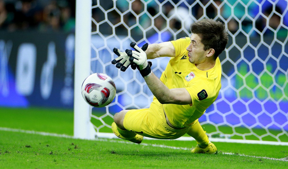 Tajikistan goalkeeper Rustam Yatimov stops a penalty