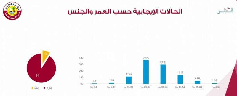 Majority of the corona virus (Covid-19) infected persons in Qatar fall in the 25 to 34-year-old age group. This was shown in a slide during the press conference.