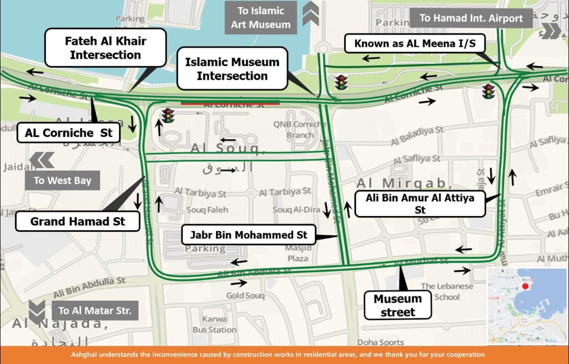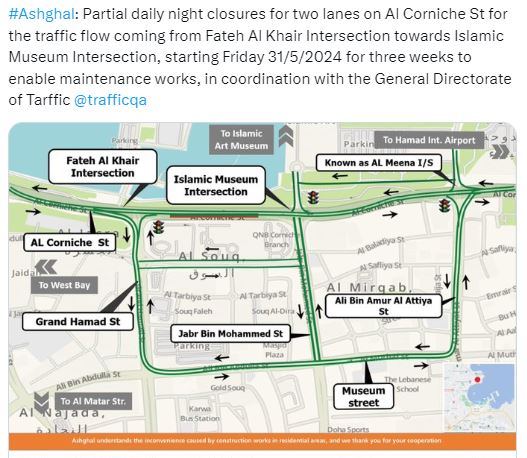 Doha, Qatar: The Public Works Authority (Ashghal) announced today, May 30, that it will implement a partial closure along Al Corniche Street every evening for three weeks.
