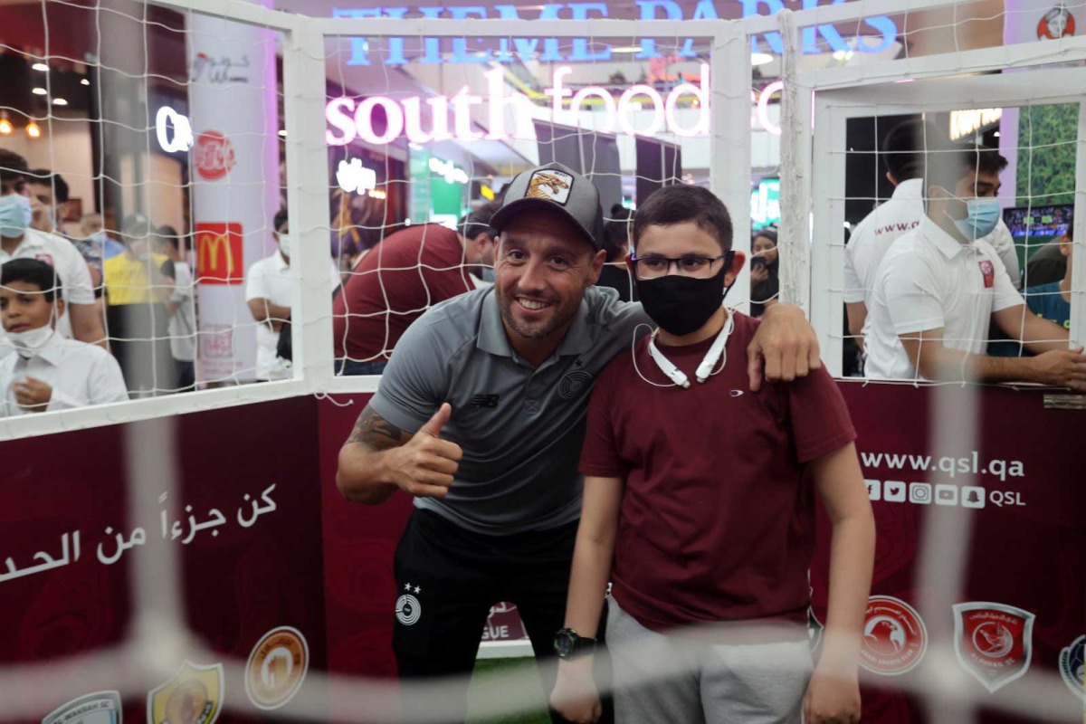 Al Sadd players Baghdad Bounedjah and Santi Cazorla pose with the Falcon Shield during a promotional event for the QNB Stars League, at Doha Festival City. The new football season kicks off on Monday. RIGHT: Spanish player Santi Cazorla with a young fan during the event