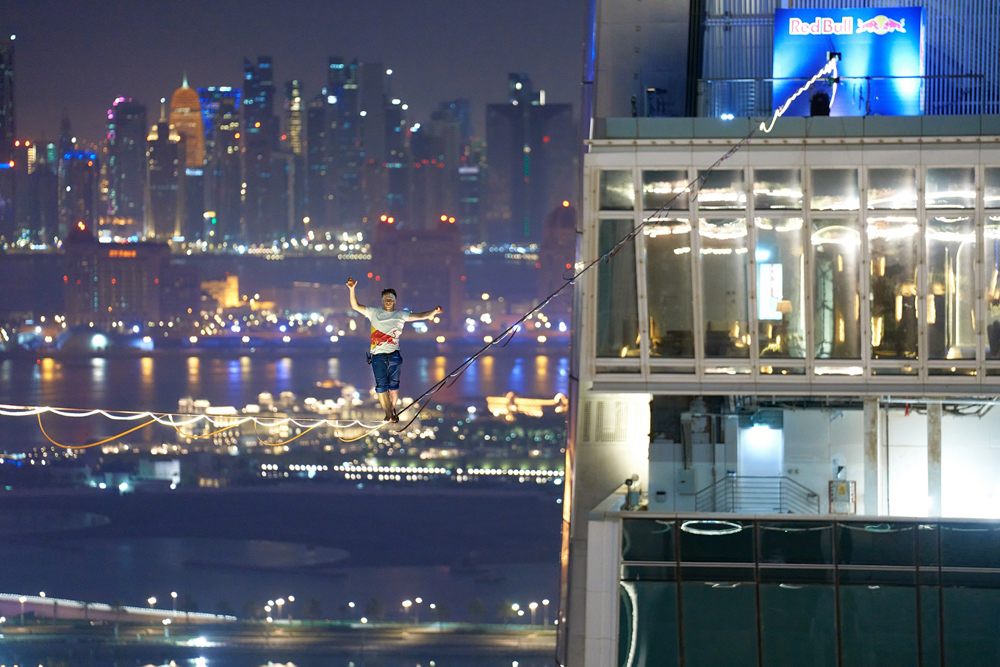 Doha, Qatar: Globally renowned Red Bull athlete Jaan Roose has completed the world’s longest LED-lit, single-building slackline to cross one of Qatar’s newest and most iconic architectural landmarks.