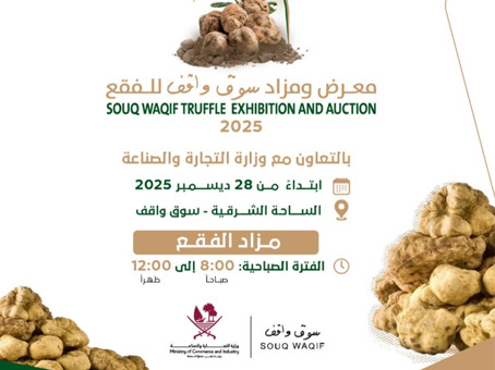 Souq Waqif management, in cooperation with the Ministry of Commerce and Industry, is hosting the Souq Waqif Truffle Exhibition and Auction. The event highlights one of the region’s most prized seasonal products, offering visitors a chance to explore and bid on fresh truffles in a traditional market setting.
