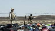 Egyptian soldiers stand guard next to the luggage and belongings of passengers of the A321 Russian airliner at the site of the crash...