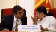Sri Lankan deputy foreign minister Harsha de Silva (L) interacts with Minister of Foreign Employment Thalatha Athukorala during a press conference in Colombo...