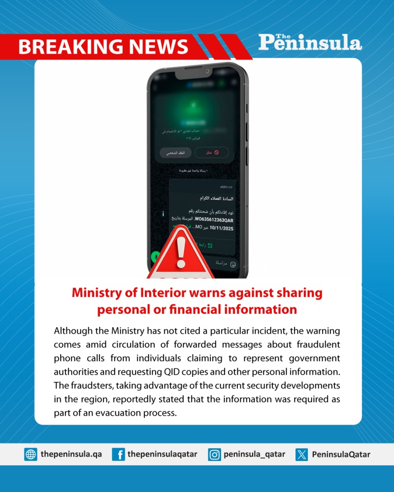 The Ministry of Interior (MoI) urged everyone to remain indoors and refrain from going out except when absolutely necessary, and to comply fully with official instructions issued by the competent authorities in the interest of public safety. Earlier today, Qatari authorities had renewed a national emergency alert urging the public to remain at home or in safe locations and avoid going out except in cases of necessity until the danger has passed.
