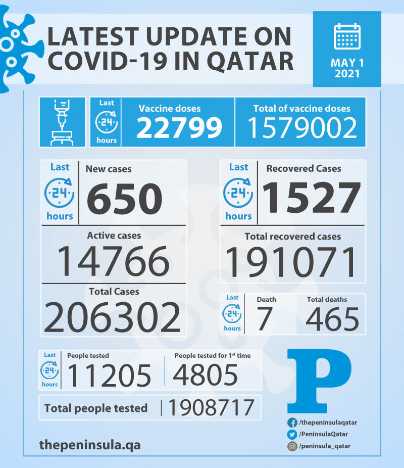 Doha: Ministry of Public Health (MoPH) today reported 650 new cases of coronavirus (Covid-19) and 1,527 people recovered from the virus in the last 24 hours, bringing the total number of people recovered in Qatar to 191,071.