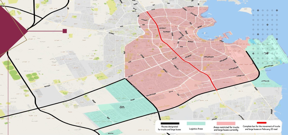 Doha, Qatar: Movement of trucks, and buses with more than 25 passengers within Doha city have been restricted during rush hour and prohibited without a permit. Meanwhile there is a complete ban on entry of these vehicles on 22 February Street at all times.