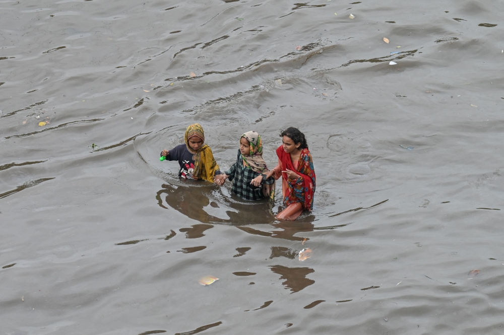 A woman with her child wade through a flooded street amid heavy rainfall in Lahore on August 1, 2024. (Photo by Arif Ali / AFP)