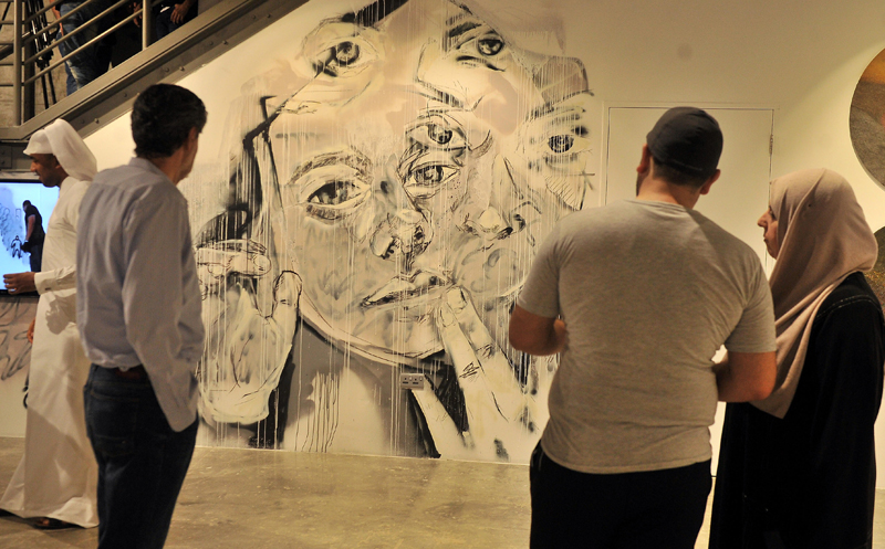 Visitors who flocked to the exhibition launch on Wednesday admired the variety of art pieces and the mediums and techniques employed by some of the best Arab contemporary artists of today in their art production. A video screening the making of Al Malik’s 260cm by 460cm “Blind Imitation” piece created using spray and mixed media provided visitors a peek into the artistic process and the depth of the work as it showed underlying images.