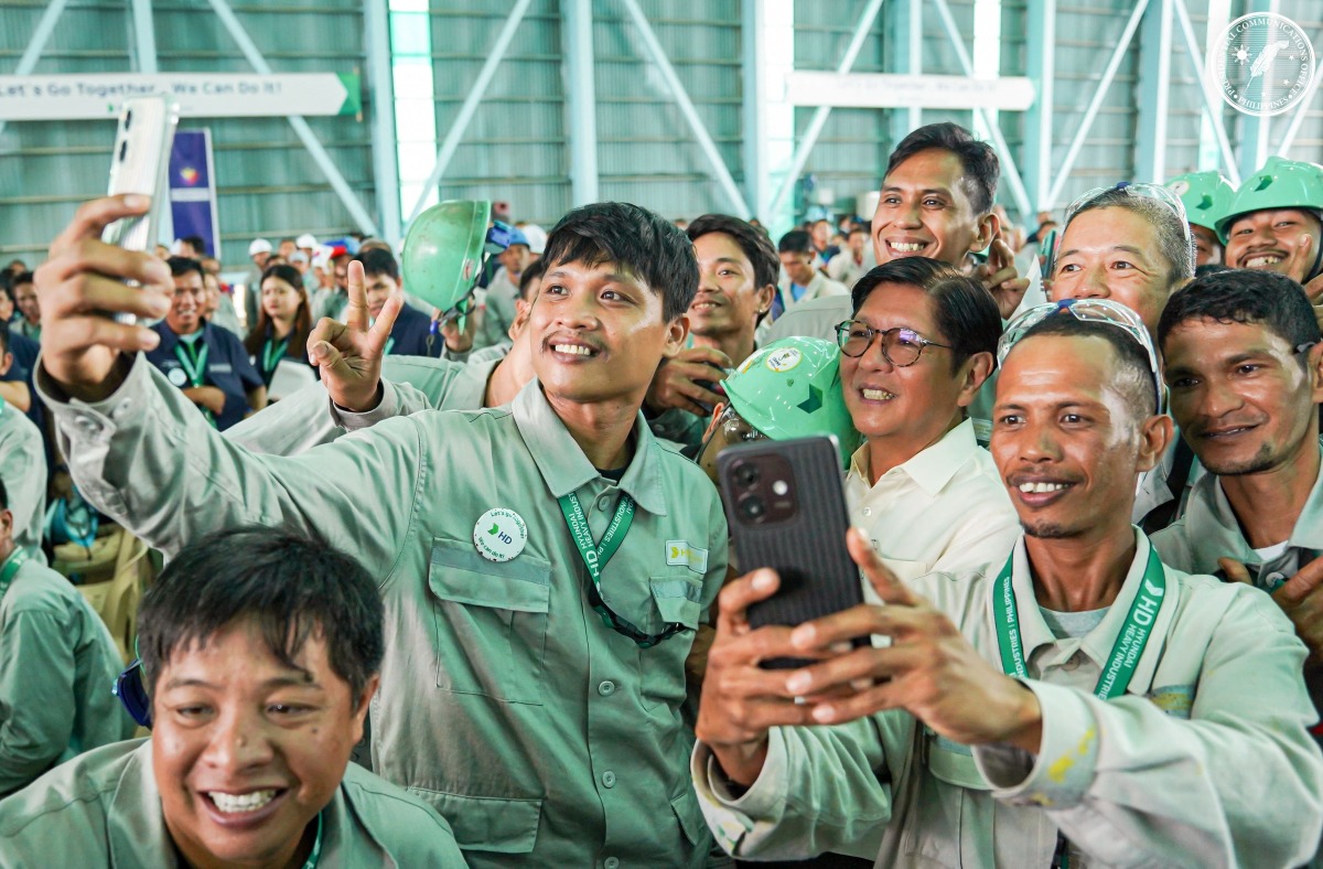 This handout photo taken and released by the Philippines' Presidential Communications Office (PCO) on September 2, 2025 shows Philippines' President Ferdinand Marcos Jr. (C) posing for selfies with the employees during the inauguration of the Hyundai Shipyard in the province of Zambales. Photo by Handout / Presidential Communications Office (PCO) / AFP