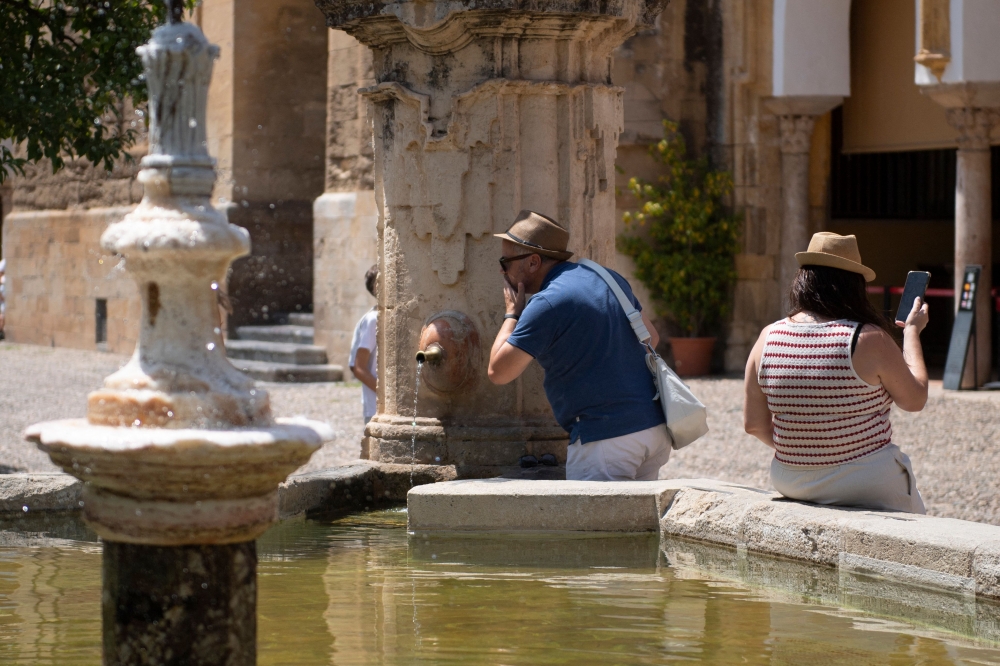 Tourists cool off in a fountain in Cordoba during a heatwave in Cordoba on August 3, 2025. The second heatwave of the year begins on the Iberian Peninsula. (Photo by Jorge Gurrrero / AFP)