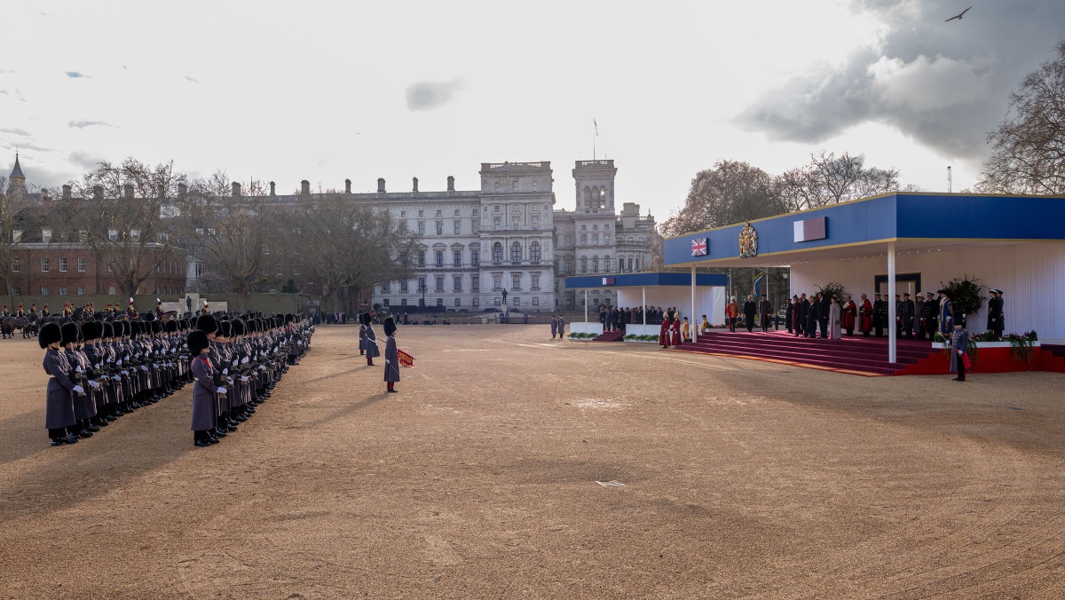The reception ceremony began with the royal salute and the playing of the national anthem of the State of Qatar, after which HH the Amir, accompanied by HM King Charles III, inspected the Royal Guard of Honor.