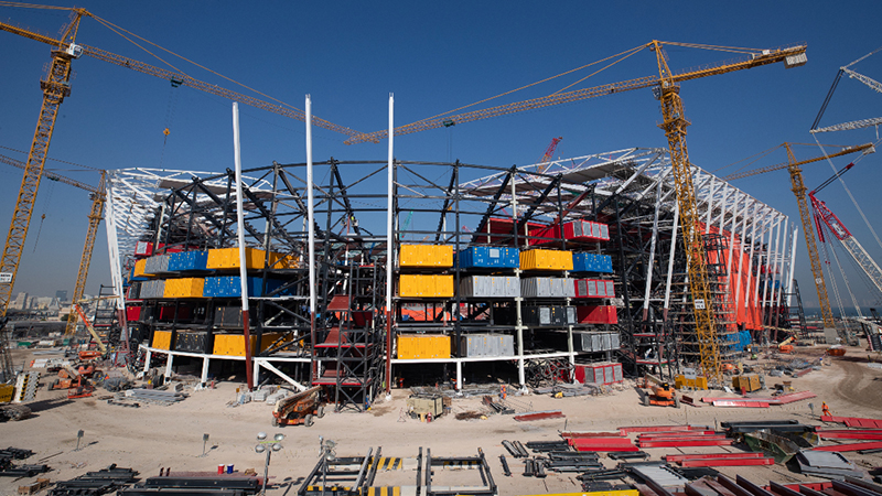 Construction update: The stadium is being built using 998 modular containers, with the delivery and installation of all containers now completed. This includes special containers for the completed Kahramaa primary substation. All remaining structural steel members, including tension rods, have also been delivered and installed. Installation of all seats in the stadium’s bowl has also been completed.