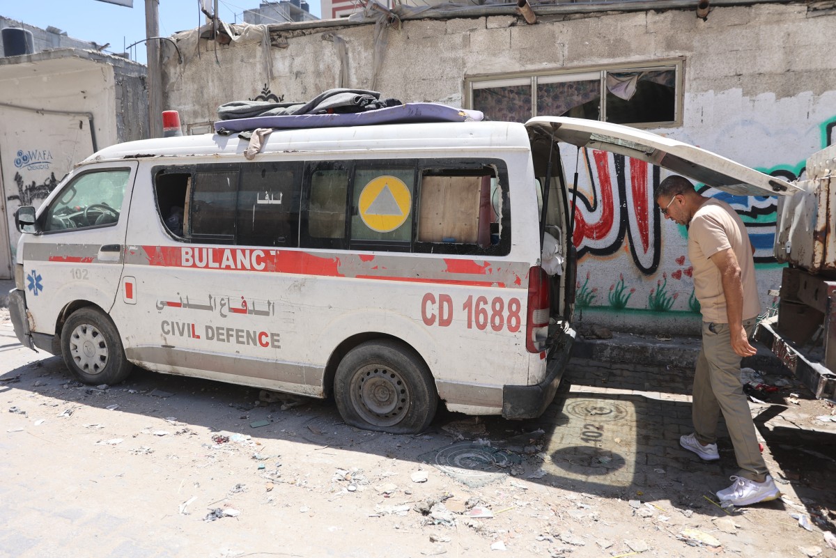A member of the Palestinian Civil Defence opens the door to a damaged ambulance, where he has been living for months, in the Jabalia refugee camp in the northern Gaza on June 1, 2024. Photo by Omar AL-QATTAA / AFP