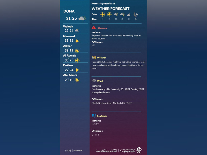 Temperatures are forecast to drop to around 19°C in Abu Samra, Messaid, and Al Khor, while in Doha, daytime temperatures are expected to range between 25°C and 31°C.