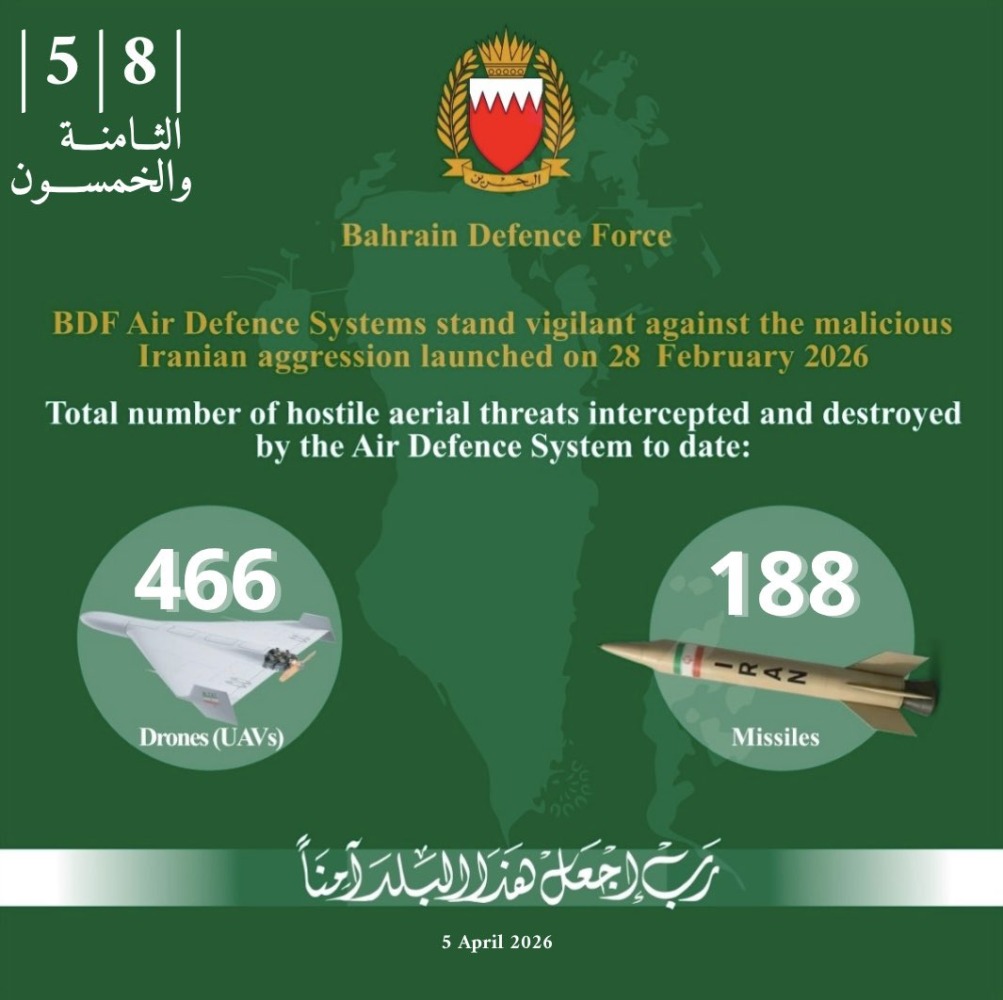 Bahrain Defence Forces intercepted and destroyed 466 drones and 188 missiles.