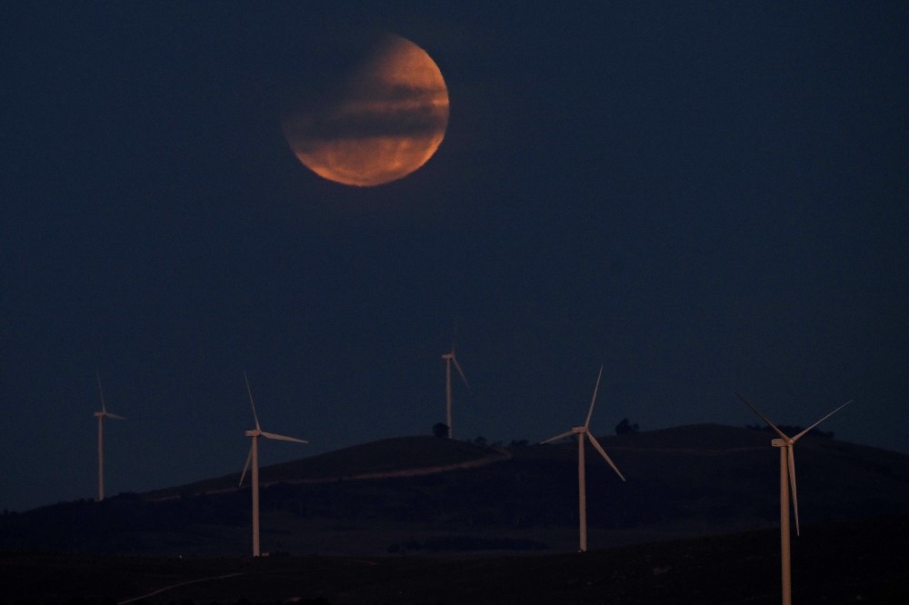 File: A "Blood Moon" is seen during a partial eclipse over Lake George near the Australian capital city of Canberra on March 14, 2025. (Photo by Izhar Khan / AFP)