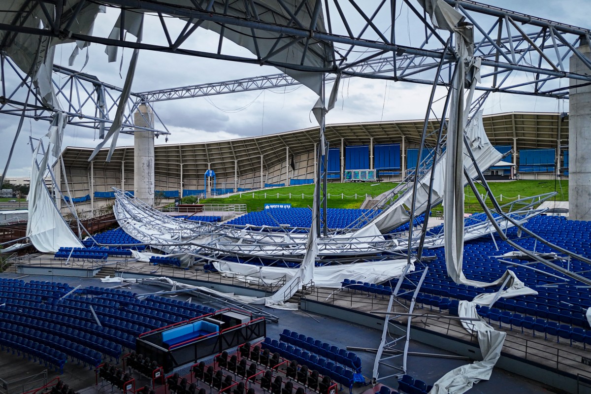 File: The MidFlorida Amphitheater's roof lies partially collapsed in the aftermath of Hurricane Milton in Tampa Florida, on October 10, 2024. (Photo by Miguel J. Rodriguez Carrillo / AFP)