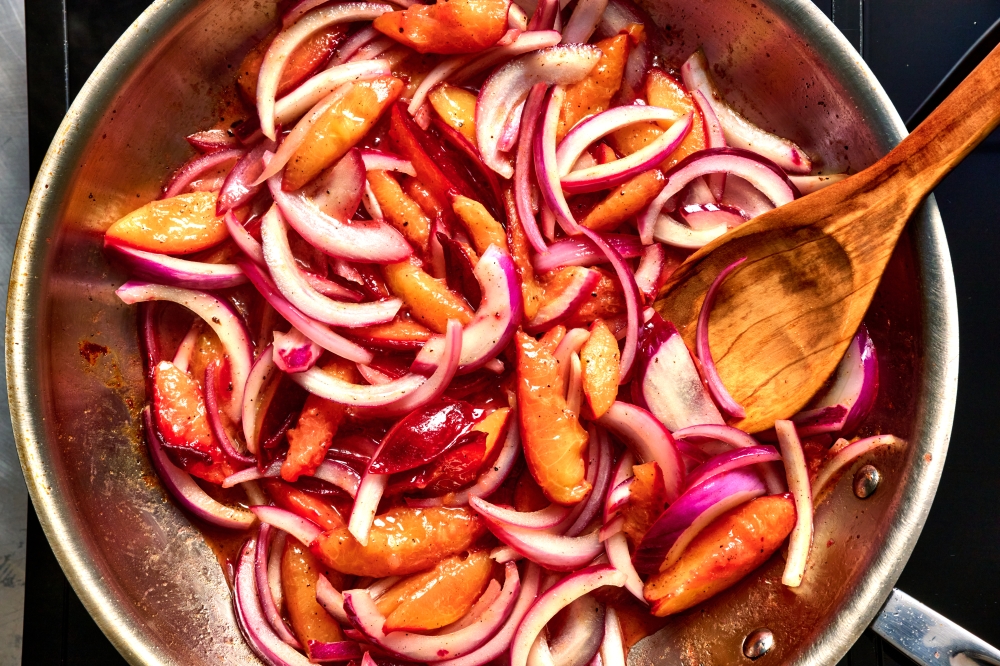 The bone-in, skin-on meat is seasoned with coriander, garlic powder and cinnamon - it’s for more than pie! - before being added to a skillet for the fat to render and the skin to get crisp. Some of the spices get left behind in the pan, rounding the sharper flavors of sliced plums and red onion, which grounds the savoriness. (A splash of balsamic vinegar lends fruity acidity to complement that of the fruit.) Then everything goes into the oven until the chicken thighs are fully cooked and the produce forms a sweet-tart, jammy sauce.