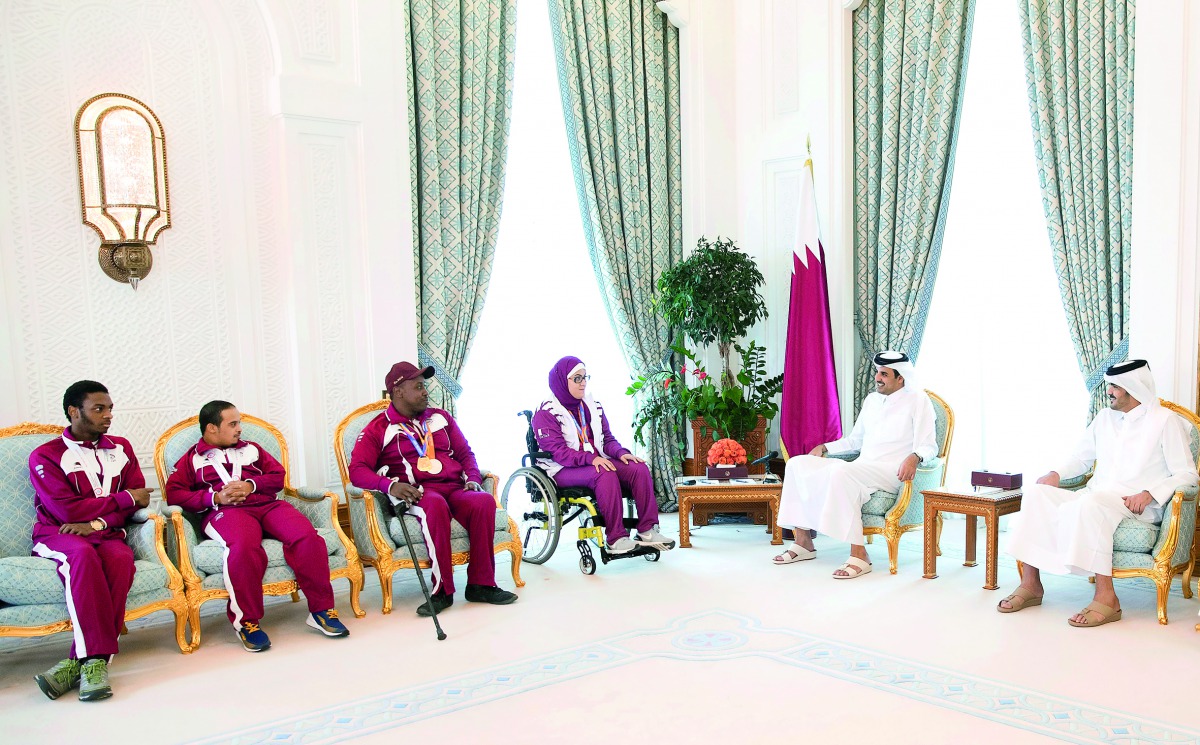 HH the Emir Sheikh Tamim bin Hamad Al-Thani met at the Emiri Diwan on Sunday with players of Qatar Paralympic Committee on the occasion of their winning in world championships.