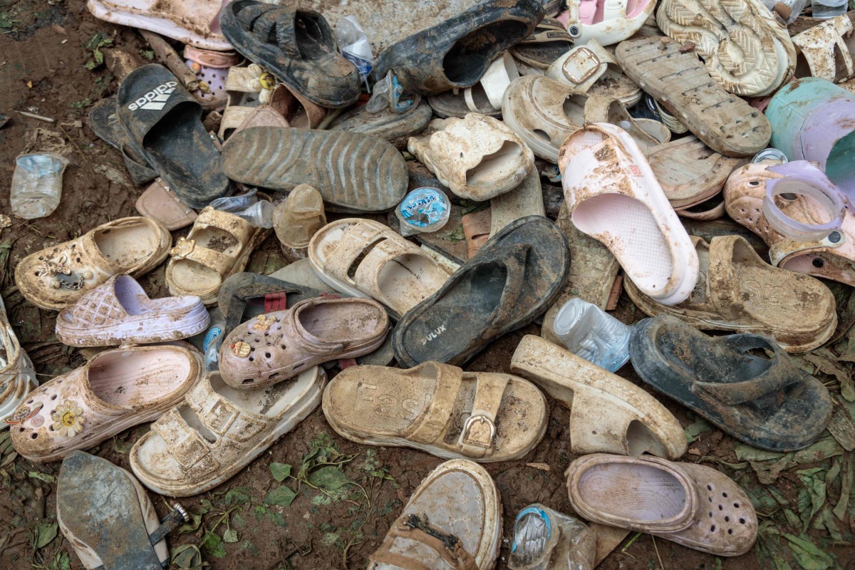 Sandals remain at a community Islamic study hall that collapsed while female Muslims were conducting studies. Photo by ADITYA AJI / AFP