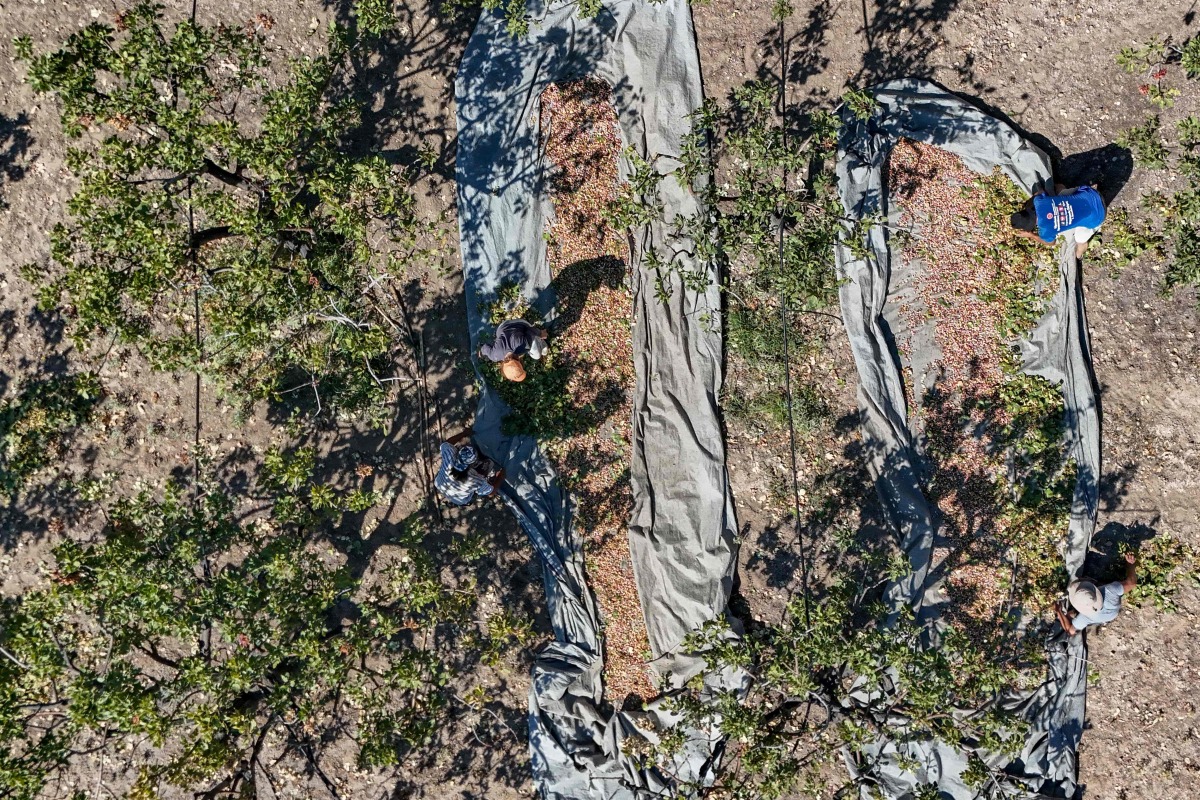 This picture taken on August 25, 2025, shows workers harving pistachios from a pistachio tree in the Greek island of Aegina. Photo by Aris MESSINIS / AFP