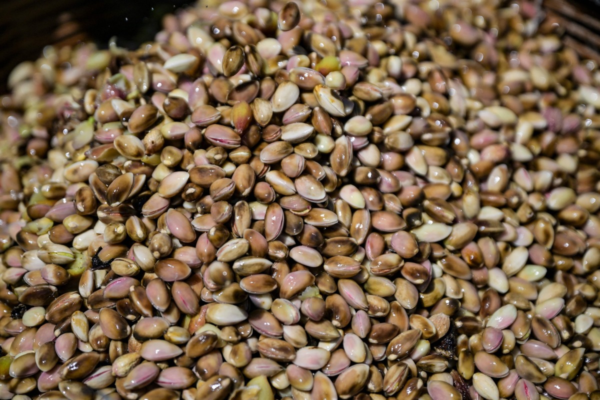 This picture taken on August 24, 2025, shows dried pistachios in the Greek island of Aegina. Photo by Aris MESSINIS / AFP