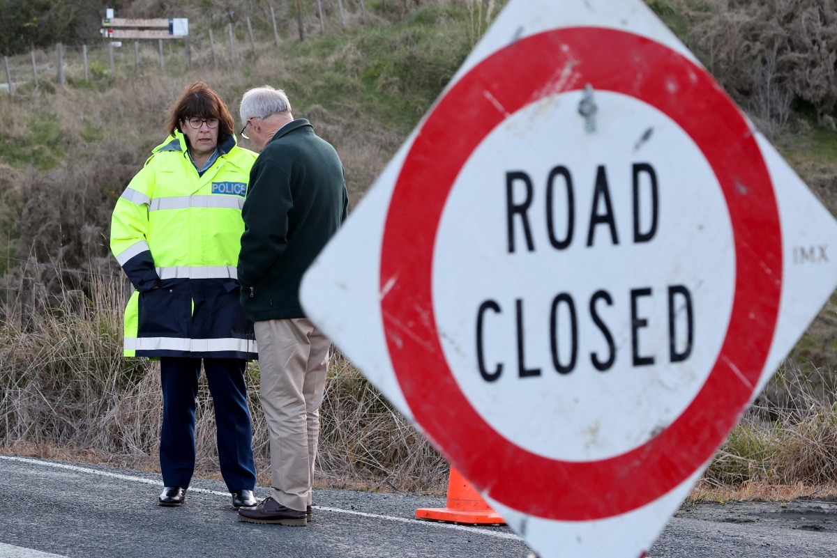 Police officers and locals stand near a roadblock where a police shootout occurred near the town of Piopio, located in New Zealand痴 Waikato region on September 8, 2025. Photo by DJ MILLS / AFP