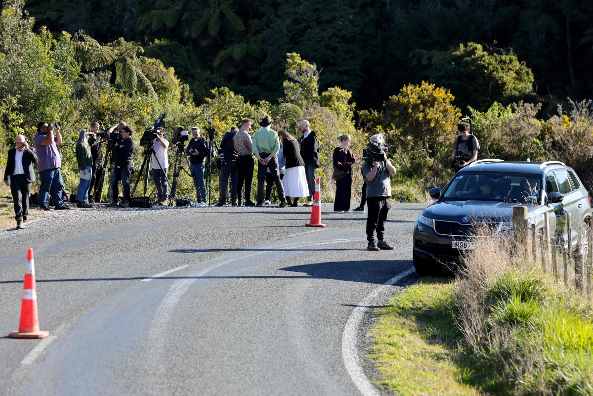 Members of the media stand on the side of a road where a police shootout occurred near the town of Piopio, located in New Zealand's Waikato region on September 8, 2025. Photo by DJ MILLS / AFP