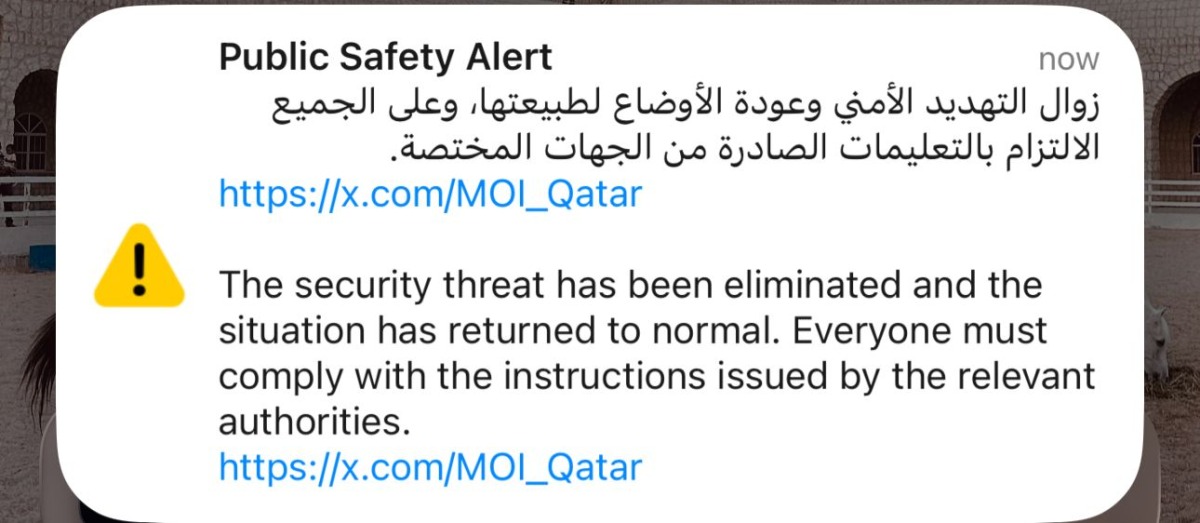 Approximately 20 minutes after sending the first alert raising the threat level, Qatar sent our another message stating that the threat was eliminated.