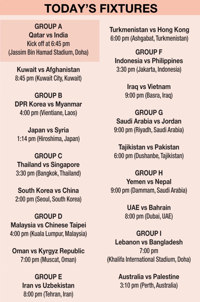 With Qatar leading the group after amassing 13 points from four wins and a draw, India, who are second with five points on a superior goal difference than Afghanistan, are eyeing three points to advance to the third round of World Cup qualifiers and secure berth in the next Asian Cup by finishing second in the group. Kuwait with four points are also in the running for runners-up spot as they host Afghanistan in the other group match today.