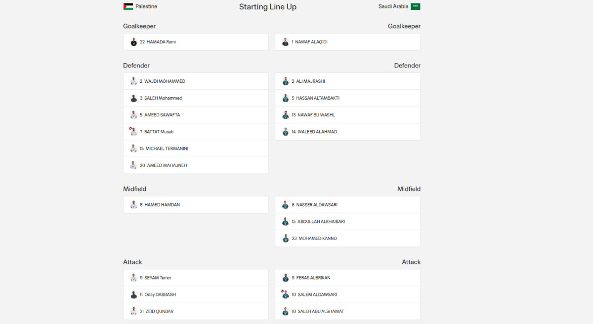 23' The Saudi goalkeeper denies a close-range attempt from the Palestinians with a sharp save.