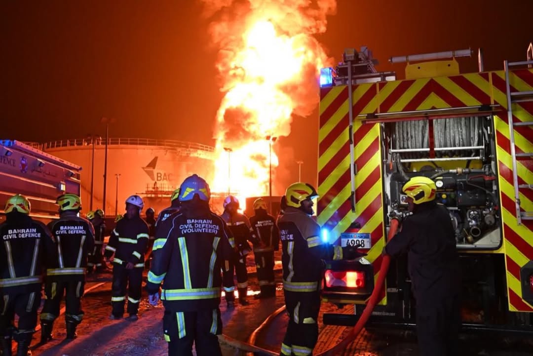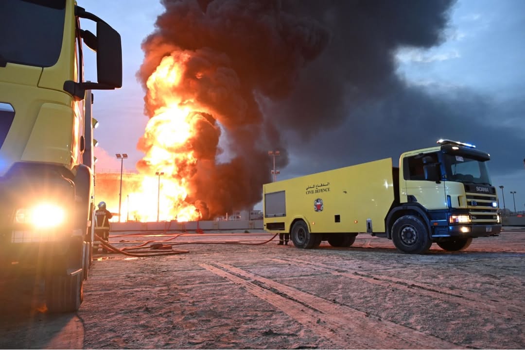 Doha, Qatar: Sharing photos from fire that broke out in the fuel tanks of one of the facilities in Muharraq Governorate, Bahrain's Ministry of Interior said that the Civil Defence teams are continuing their efforts to control the fire.