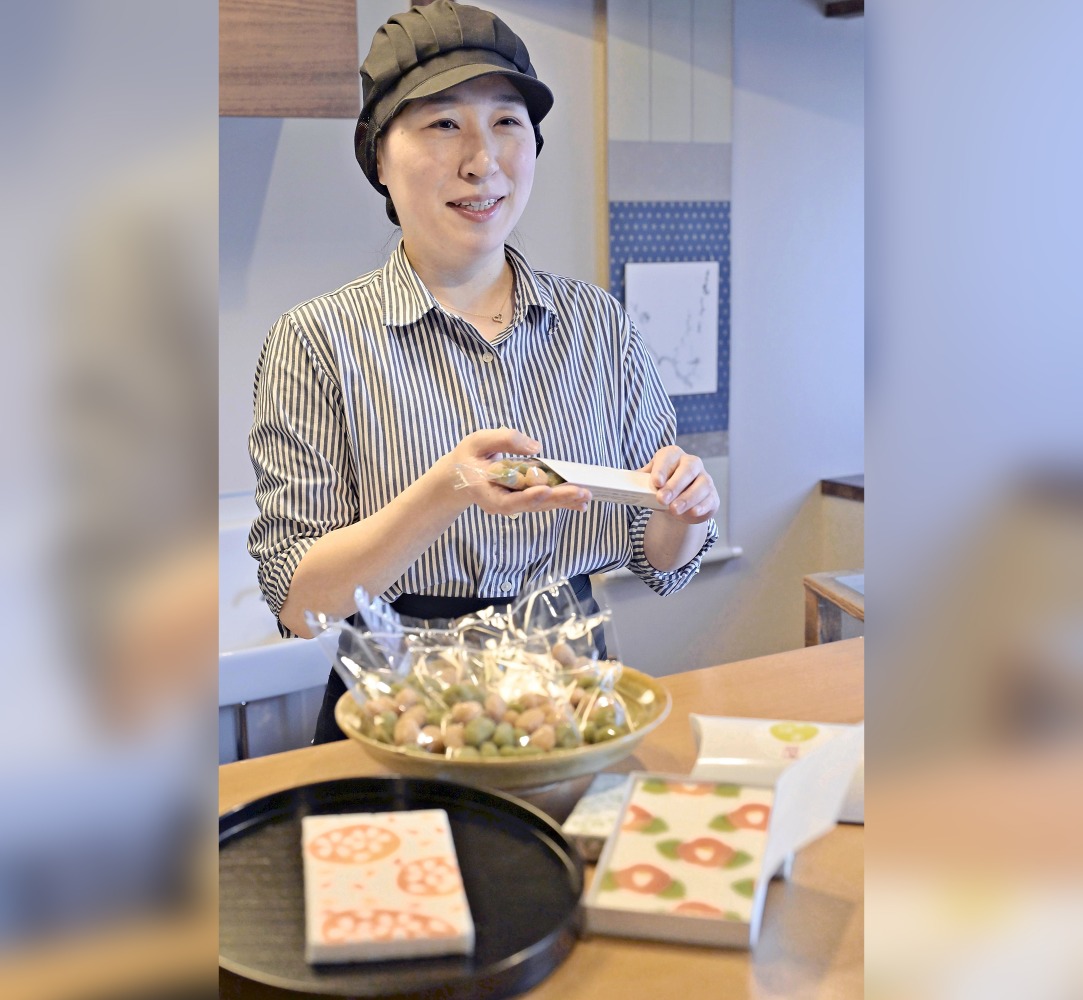 Ryoko Yoshino packages Kasuga no mame, or suhama shaped to resemble beans, in her shop in Nakagyo Ward, Kyoto.
