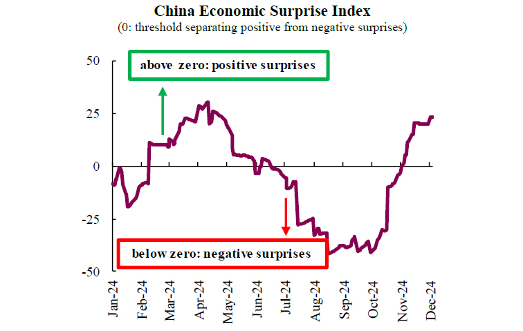 First, economic indicators are delivering positive surprises, with signals that the constructive momentum will persist. The Economic Surprise Index comfortably entered the positive range in Q4-2024, amid better-than-expected gauges across key production sectors. Property markets displayed signs of stabilization as the declines in prices and sales moderated, with some statistics even exhibiting positive growth. This comes after the government ramped up incentives in the sector by relaxing conditions on mortgages and announced funds for targeted projects and housing for lower-income families.