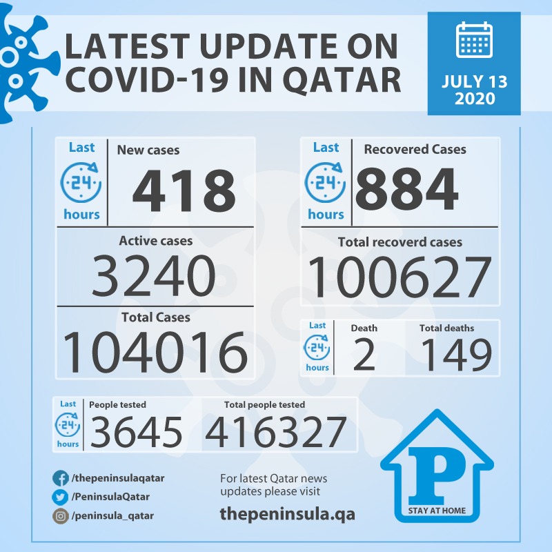 Doha: Ministry of Public Health today recorded 418 new cases of coronavirus (COVID-19) and 884 people recovered from the virus in the last 24 hours, bringing the total number of people recovered in Qatar to 100627. The Ministry also announced 2 death due to Covid-19.