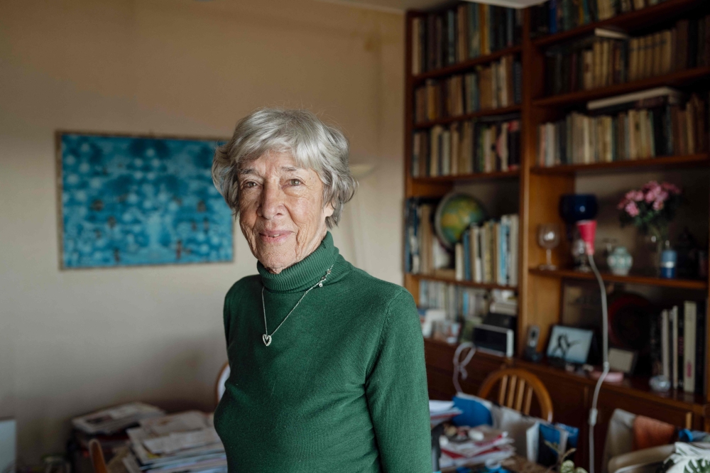 Survivor of Japanese camps during World War II and psychologist Tineke Einthoven, 87, poses with family photographs at her home in Monaco, on January 13, 2025. (Photo by Frederic Dides / AFP)