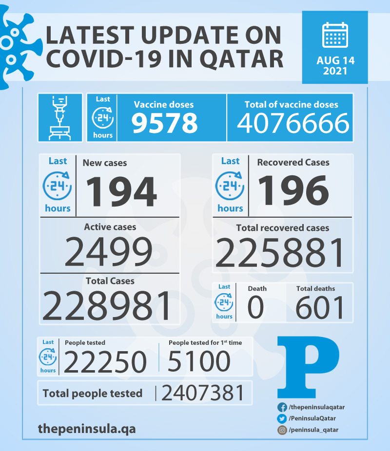 The total number of positive Covid-19 cases recorded in Qatar till now is 228,981 and there are 2,499 active cases under treatment.