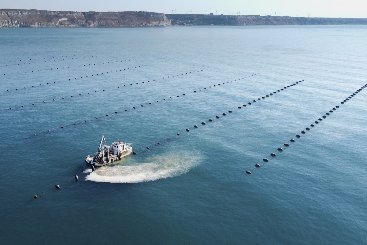 This aerial photograph shows a mussel harvesting ship collecting mussel in a farm near Cape Kaliakra, in northern Bulgarian Black Sea Coast on August 18, 2025. Photo by Nikolay DOYCHINOV / AFP