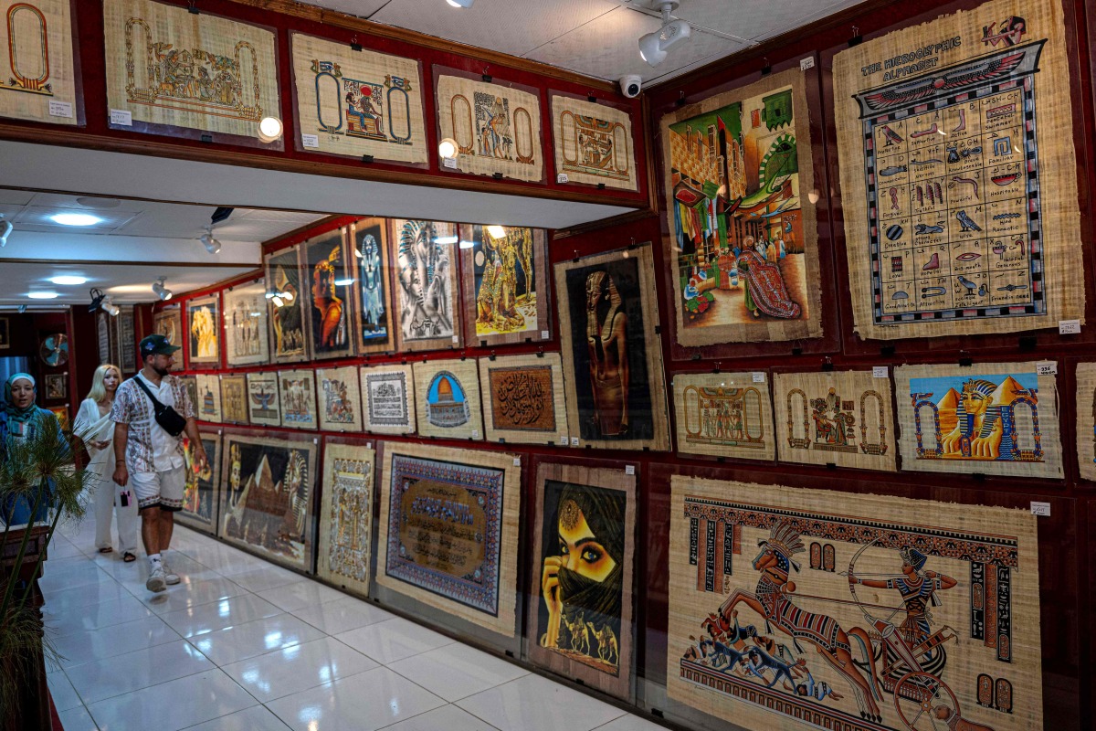 Tourists visit a papyrus shop near the Great Pyramids plateau in Giza, south of Cairo, on June 10, 2025. Photo by Khaled DESOUKI / AFP