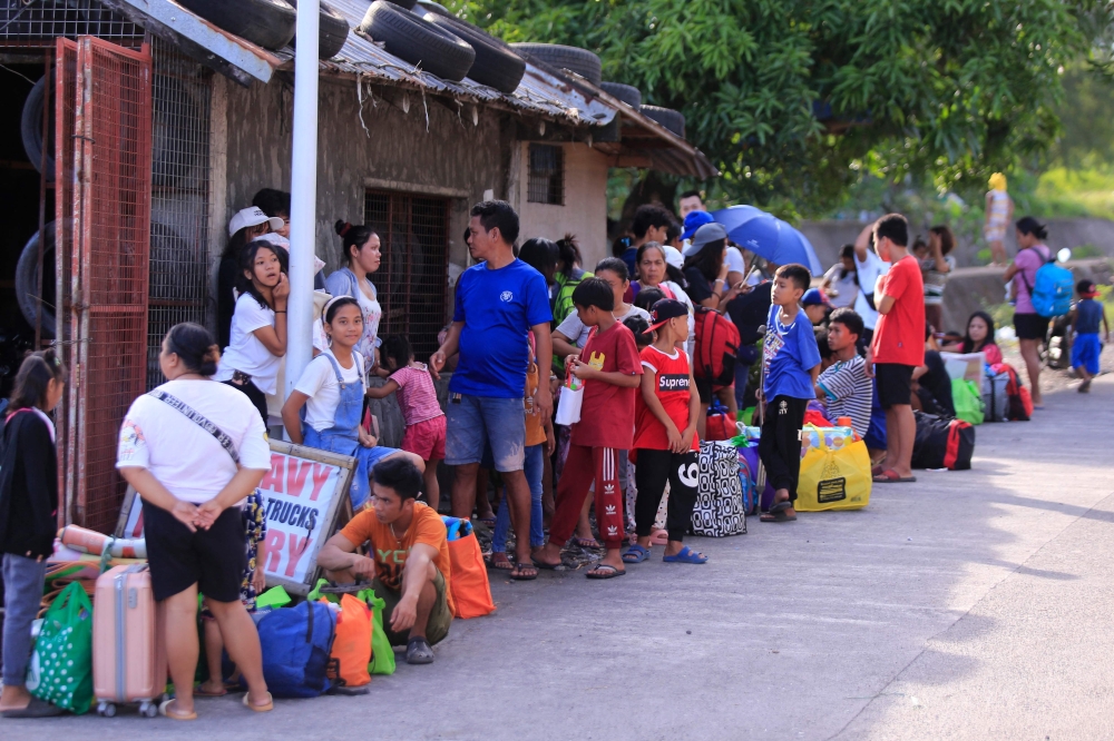 Residents get off a truck after the local government implemented a preemptive evacuation in Daraga, Albay on November 15, 2024, ahead of the landfall of Typhoon Man-Yi. Photo by Charism SAYAT / AFP
