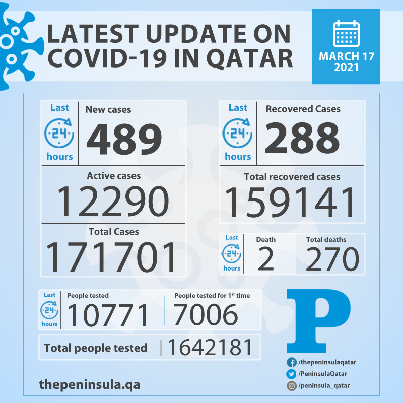 Doha: Ministry of Public Health (MoPH) today reported 489 new cases of coronavirus (Covid-19) and 288 people recovered from the virus in the last 24 hours, bringing the total number of people recovered in Qatar to 159,141.