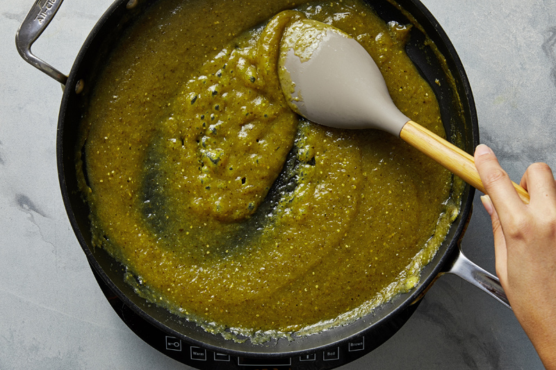 Margarita Carrillo Arronte's original recipe called for twice as much sauce to create a more casserole-type experience. We decided to adapt it for a slightly quicker, crispier version finished in the skillet you cook the sauce in. If you'd prefer to bake the chilaquiles, check out the variation below.