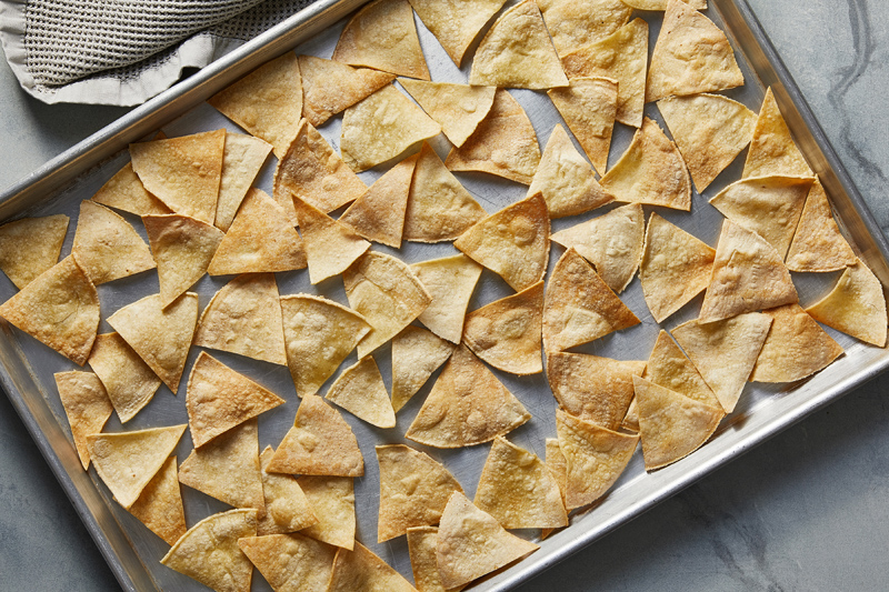 Lightly grease a large rimmed baking sheet with oil. Brush the top of each tortilla with a little oil, dividing them into two stacks and then cutting through each stack so the tortillas have been sliced into sixths. Separate and scatter the pieces on the baking sheet, keeping them in one layer as much as possible, though a little overlap is fine. Bake for 15 to 20 minutes, stirring two to three times, until the tortillas are crisp and a pale golden brown.