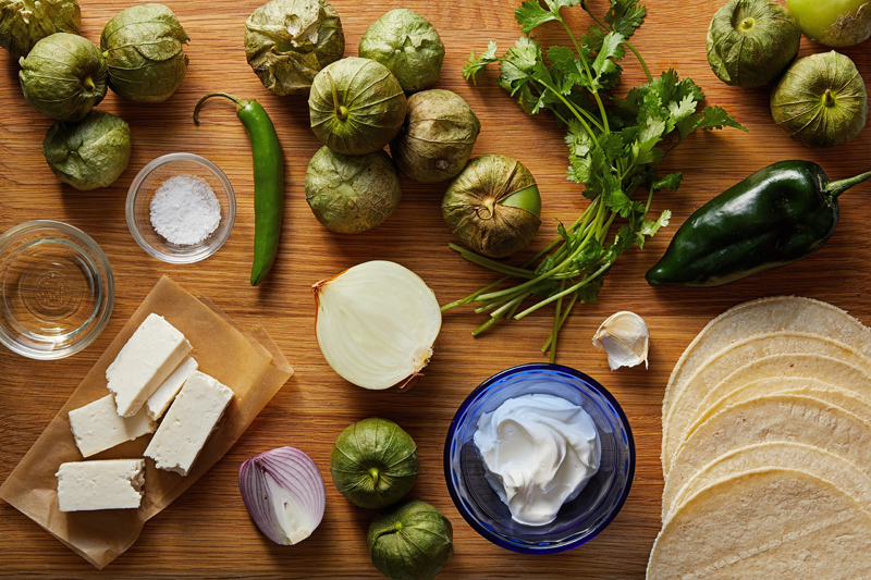 Ingredients for chilaquiles including serrano peppers, garlic, oil, tortillas, sour cream, salt, cheese and tomatillos