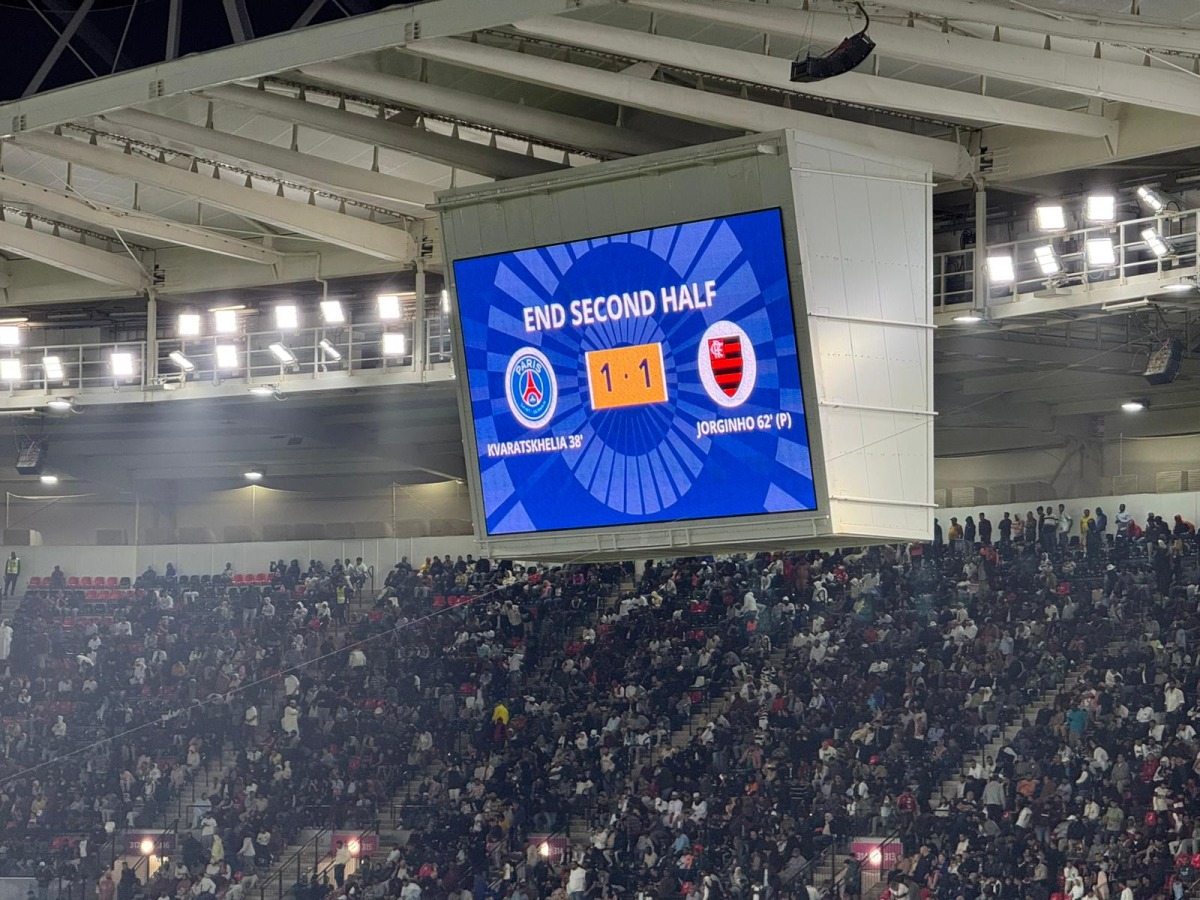 A dramatic end to regulation time as Marquinhos clears his teammate Dembélé’s shot off Flamengo’s goal line, sending the match into extra time — two 15-minute halves to decide the winner.
