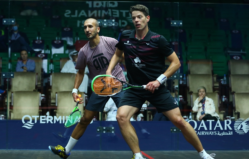 James Willstrop in action against USA's Faraz Khan during their Qatar QTerminals Classic first round match at the Khalifa International Tennis and Squash Complex, yesterday. Pic: Twitter/@PSAWorldTour