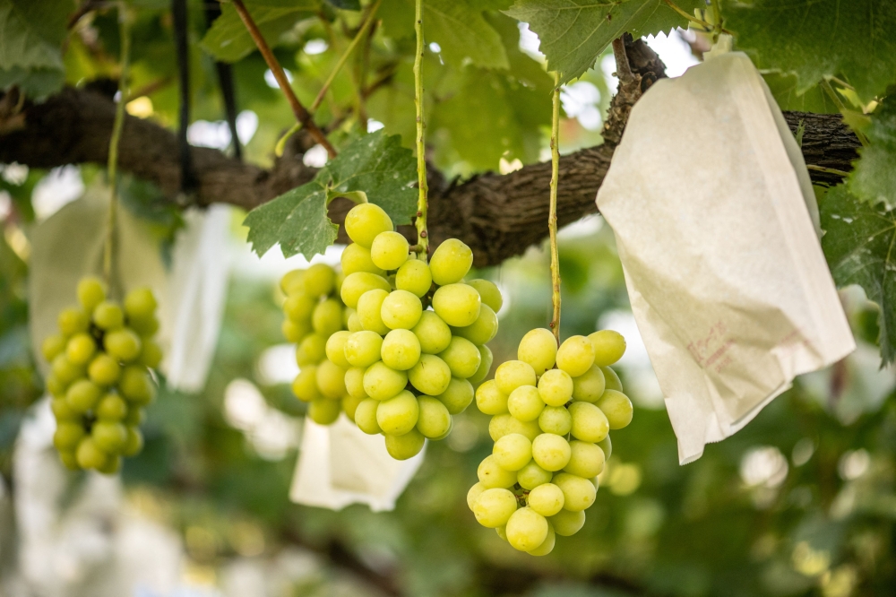 This picture taken on September 14, 2023 shows Shine Muscat grapes growing on Yuki Nakamura's farm in Tomi city, Nagano Prefecture. Photo by Philip FONG / AFP