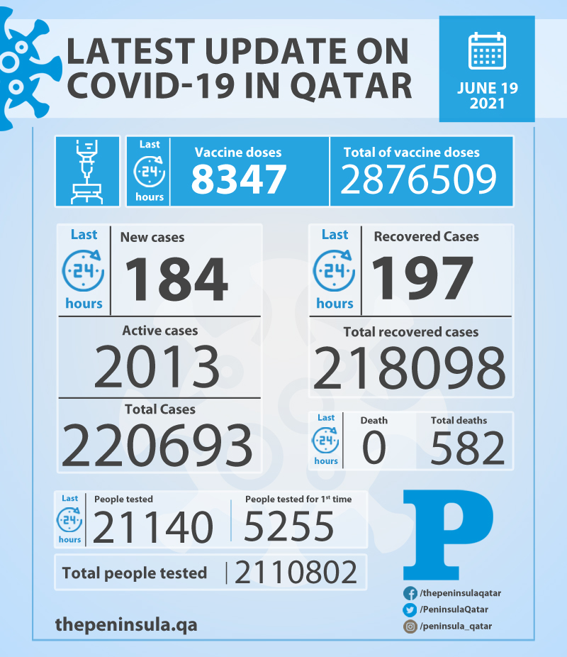 Doha: Ministry of Public Health (MoPH) today reported 184 new cases of coronavirus (Covid-19) and 197 people recovered from the virus in the last 24 hours, bringing the total number of people recovered in Qatar to 218,098.