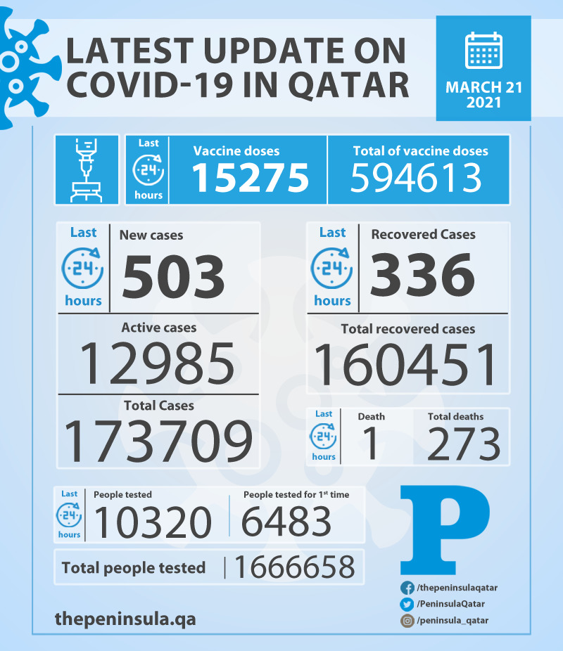 Doha: Ministry of Public Health (MoPH) today reported 503 new cases of coronavirus (Covid-19) and 336 people recovered from the virus in the last 24 hours, bringing the total number of people recovered in Qatar to 160,451.